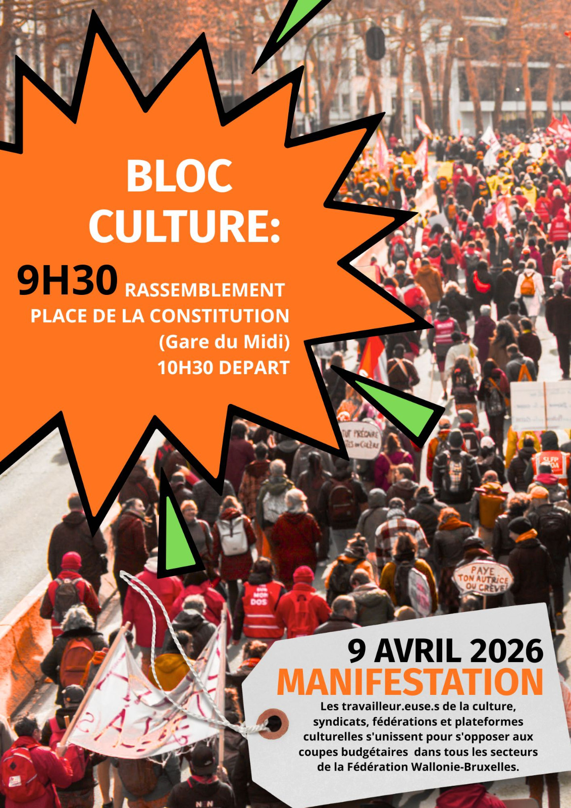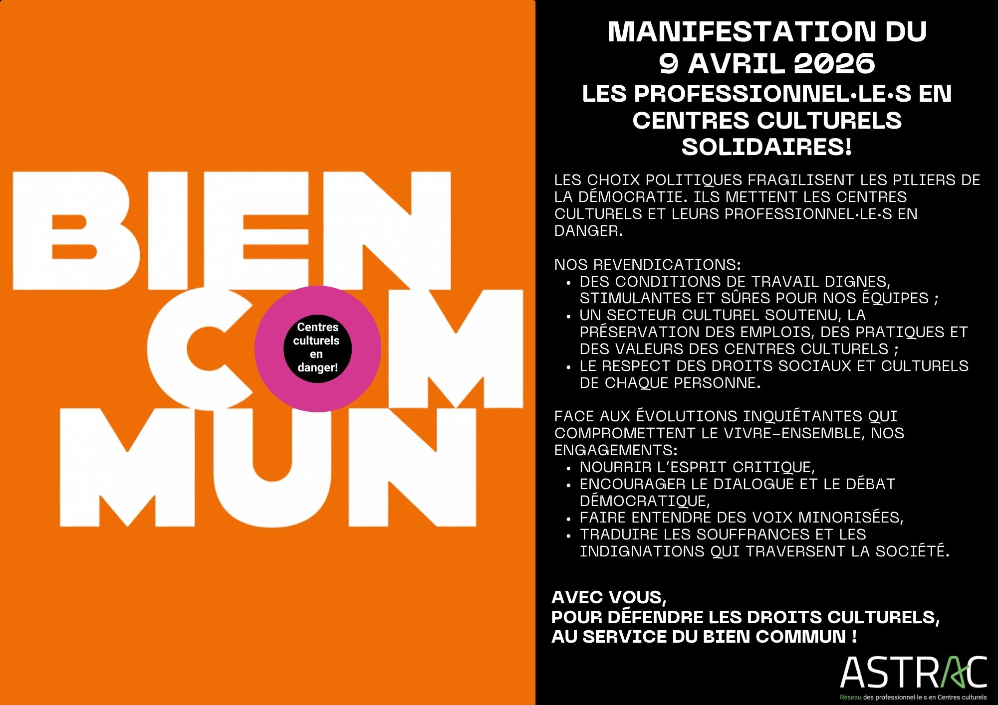 Nous marcherons avec le Bloc Culture et les fédérations socioculturelles pour contester l’asphyxie des nos secteurs suite au cumul d’économies et de réformes et alerter sur l’importance cruciale des postes APE et ACS.